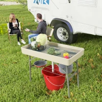 • - Built-in Table Cooler with Drain: This innovative ice cooler table keeps drinks perfectly chilled all day. The drainpipe lets you easily empty excess water, so you can focus on having fun instead of cleaning up. Spacious shelf for added storage